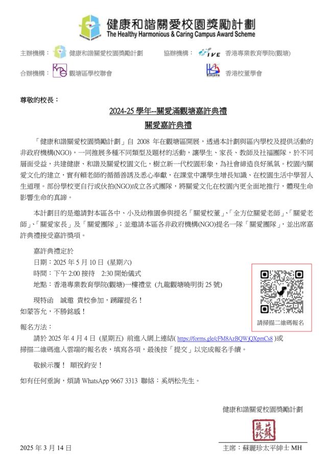 2024-25 學年-關愛滿觀塘嘉許典禮 最新消息, 活動By AclDesign2025-04-11健康和諧關愛校園獎勵計劃主辦機構健康和諧關愛校園獎勵計劃協辦機構香港專業教育學院(觀塘) 香港校董學會合辦機構…