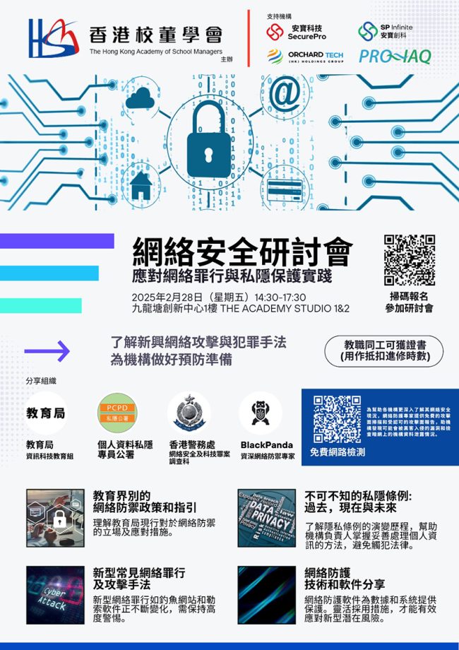 網絡安全探討:應對網絡罪行與私隱保護實踐 最新消息, 講座By AclDesign2025-01-18網絡安全探討:應對網絡罪行與私隱保護實踐隨著網絡攻擊日益猖獗,教育界已成為網絡攻擊的首要目標。教育機構承擔處理…