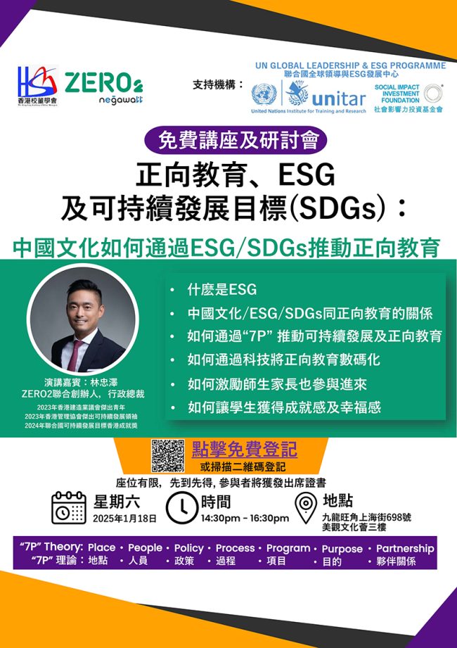 正向教育、ESG及可持續發展目標(SDGs) 最新消息, 講座By AclDesign2025-01-18正向教育、ESG及可持續發展目標(SDGs)演講嘉賓林忠澤ZERO2聯合創辦人,行政總裁 2023年香港建造業…