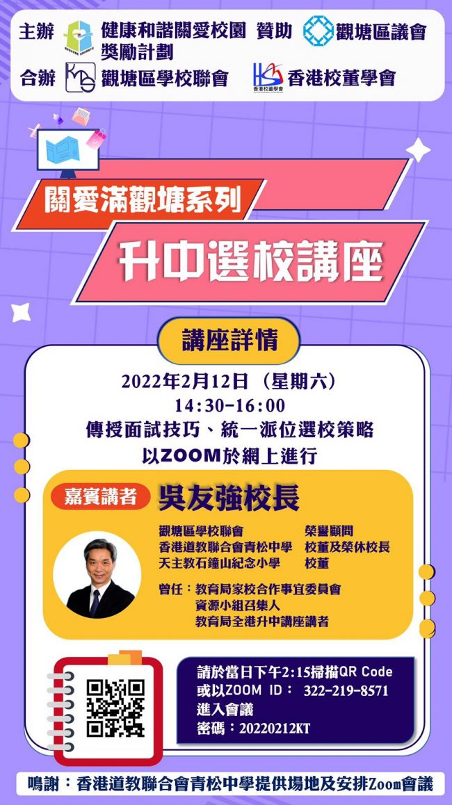 關愛滿觀塘系列-升中選校講座 最新消息, 講座By AclDesign2022-02-17關愛滿觀塘系列-升中選校講座 日期 : 2022年2月12日(星期六) 時間 : 14:30 – 16:30 …